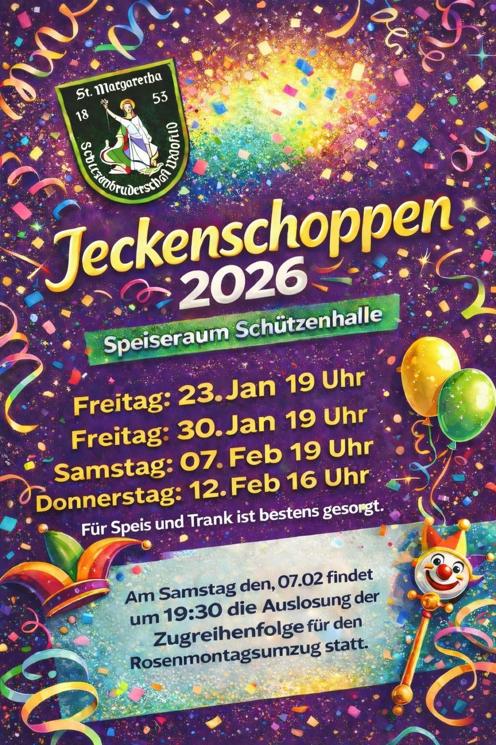 Auch in diesem Jahr findet in der Zeit vor dem großen Karneval wieder der Jeckenschoppen im Speiseraum statt.